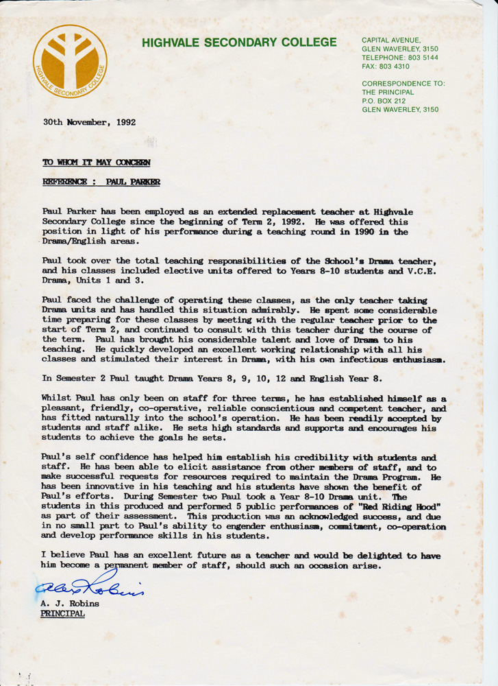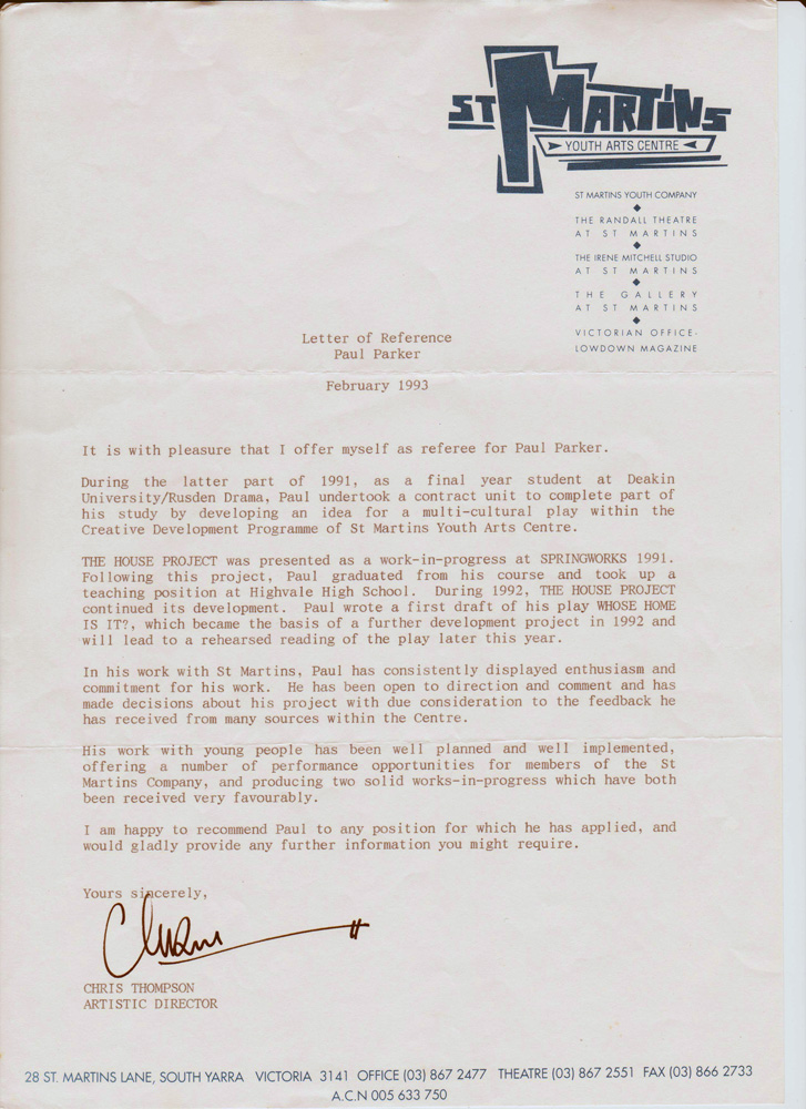 The Victorian Center for Youth Arts – St. Martins Theatre, Victoria 1991-1990 reference letter