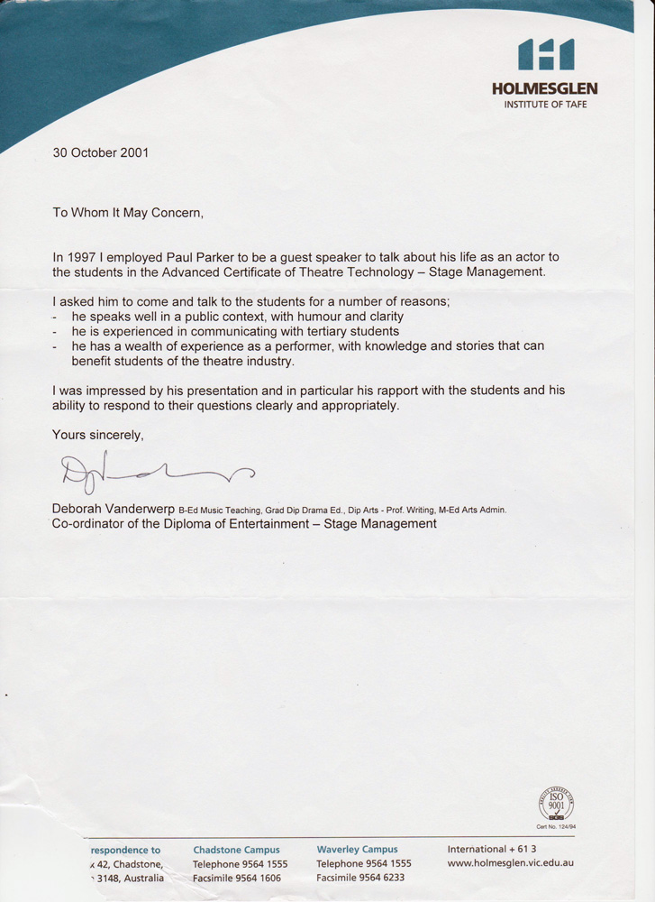 Holmesglen Institute of T.A.F.E. – Melbourne, Victoria 1996 reference letter