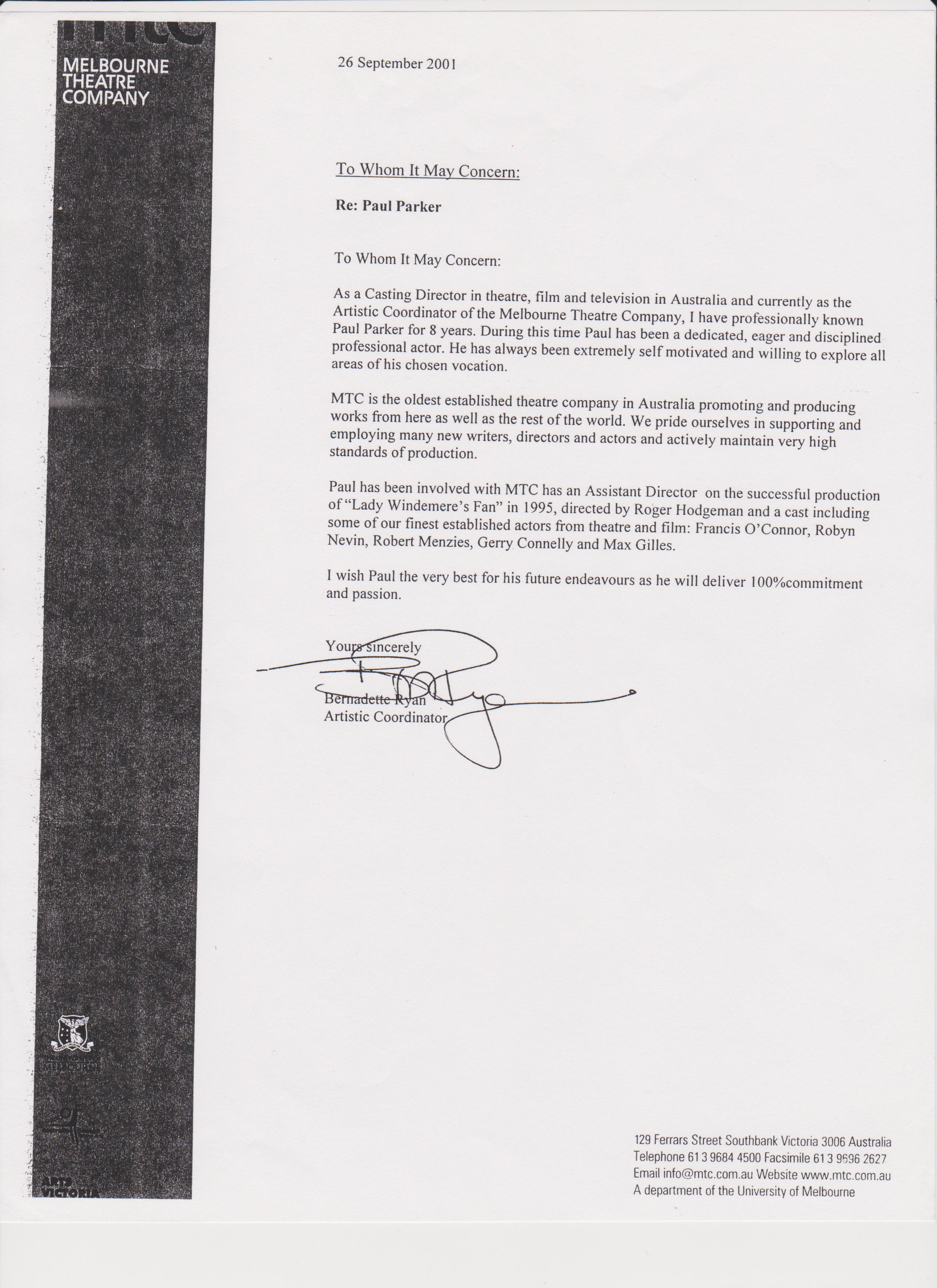 Lady Windemere’s Fan Melbourne Theatre Company 1995 reference letter