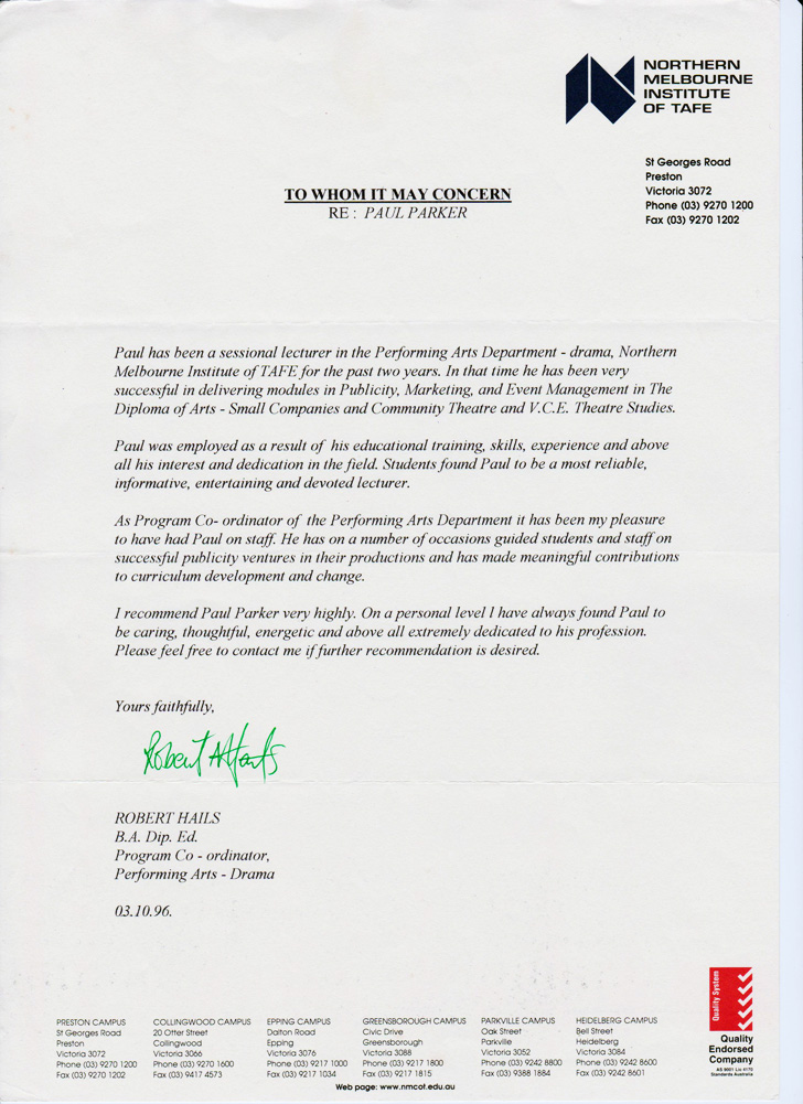 Northern Melbourne Institute of T.A.F.E. Victoria 1996 – 1995 reference letter