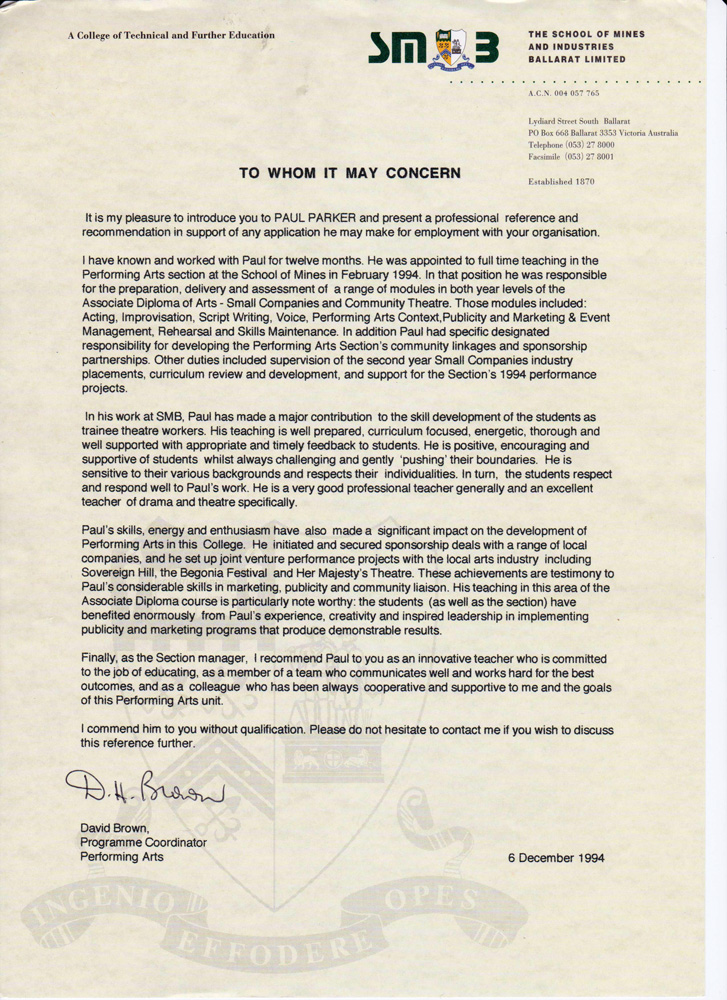 The School of Mines and Industries Ballarat Limited, Victoria 1994 reference letter