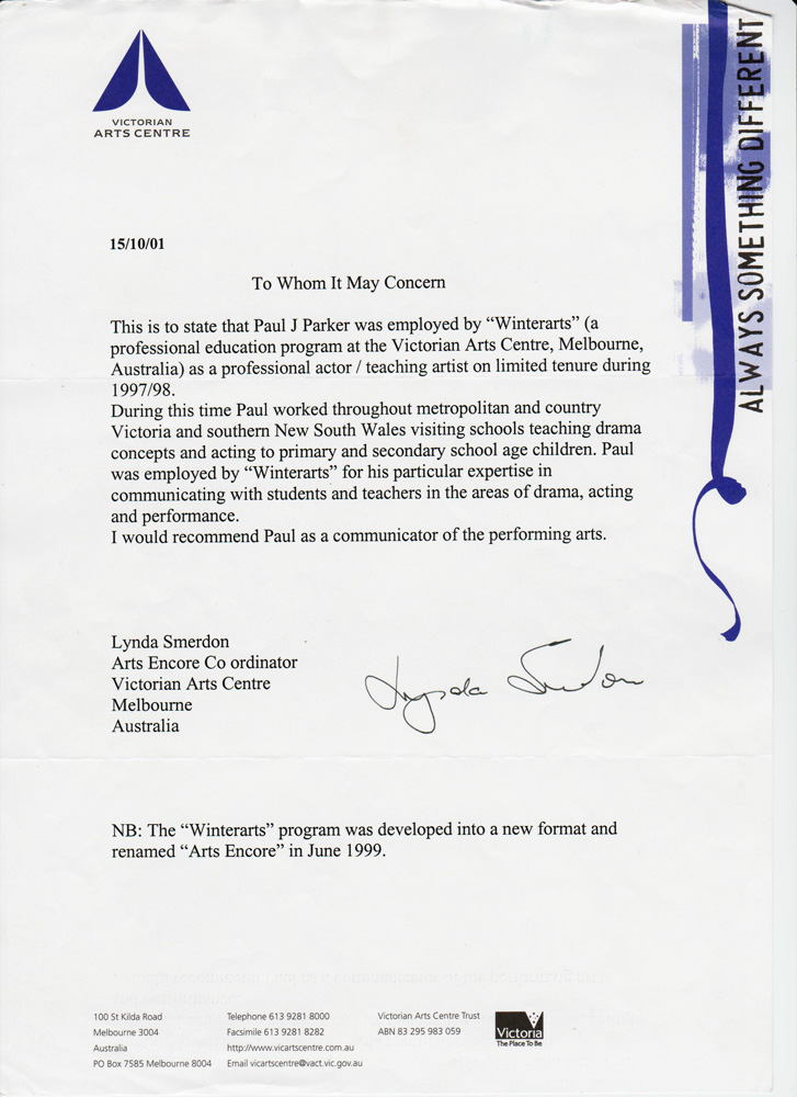 Victorian Arts Centre, Art Education Program – Melbourne Victoria 1996 reference letter