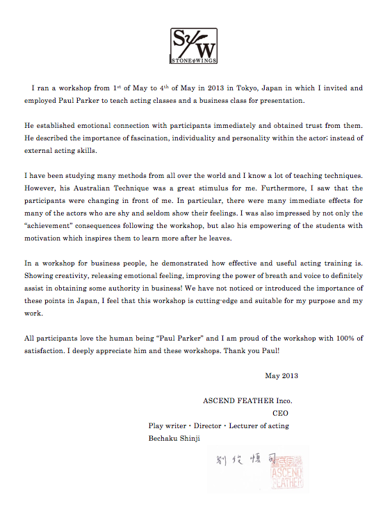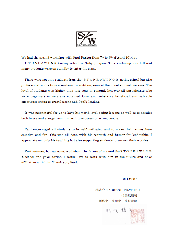 Stone Wings Acting School, Tokyo Japan – 2014 reference letter